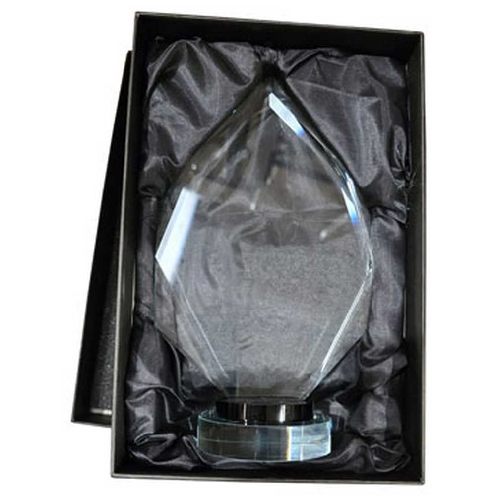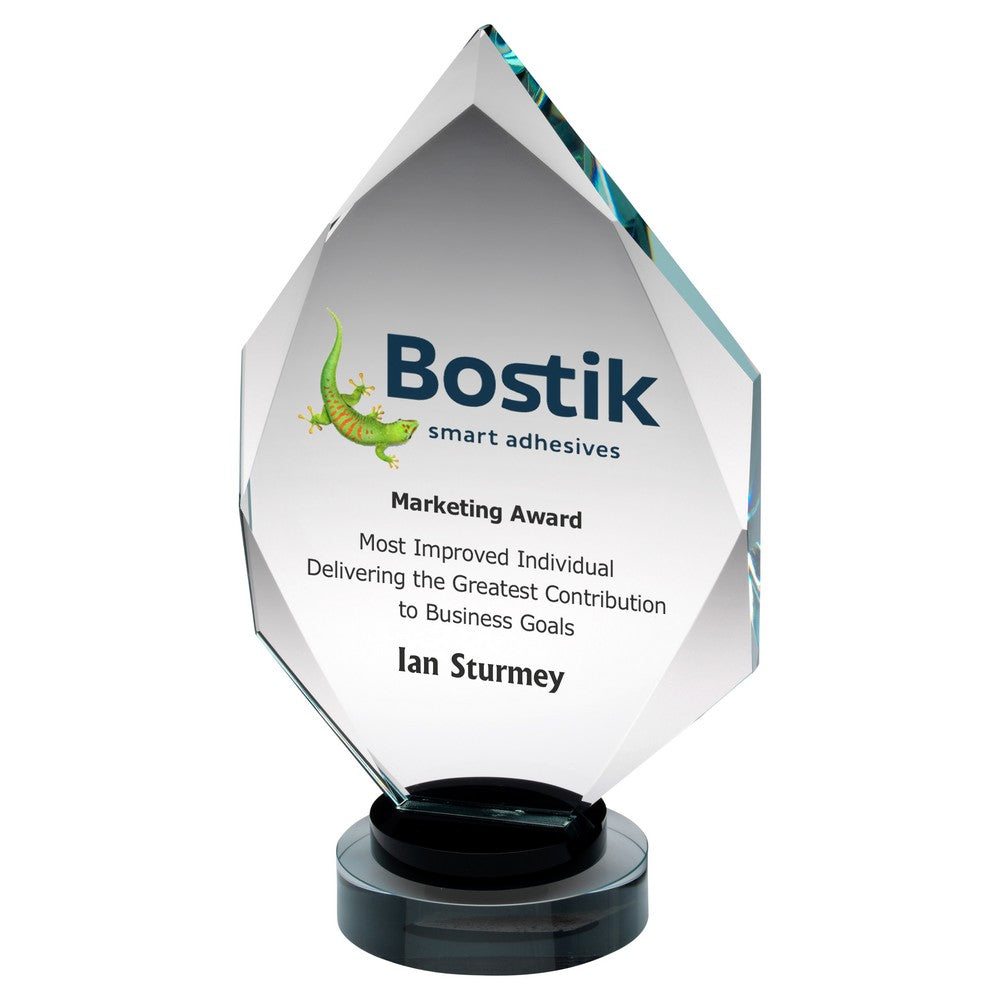 Available in 3 sizes, this trophy features a slick, modern 15mm thick clear glass diamond shape on a round black glass base. Available with colour printed personalisation, perfect for displaying a message of your choice! Makes a perfect gift or award for all events and presentations. You can also upload an image/photo for colour printing alongside text of your choice. Sold with a presentation box.