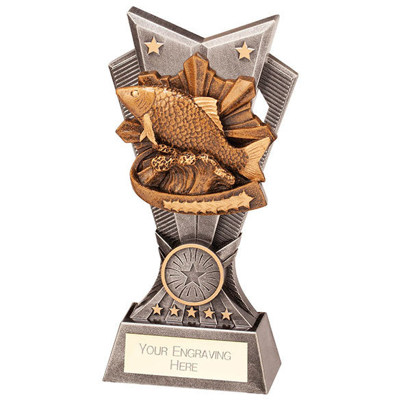 Spectre Fishing Resin Award, in a bronze and silver finish. This trophy features a fish leaping from water scene, with an explosive backdrop effect on a base, completed with star details. Available with personalised engraving, it's perfect for all fishing events and presentations. You can also upload an image/logo on the round 1" insert space provided.