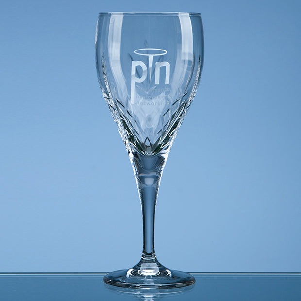 The Mayfair lead crystal goblet perfectly combines a modern stylish glass with a traditional diamond cut design with engraving panel. It can be personalised with any crest, logo or wording to create a gift that is sure to take pride of place when put on display at home or at work. There are also champagne flutes, whisky tumblers, high ball tumblers and brandy glasses available in the Mayfair range. The glass can be supplied in a single or paired satin lined presentation box which should be ordered separately.