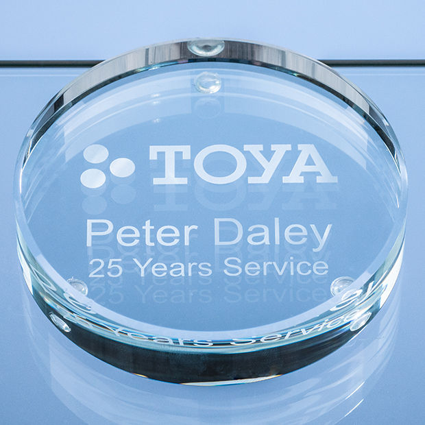 The 9cm round clear glass paperweight is fantastic value for money and features quality personalised sandblast engraving. It would make an ideal personalised gift to a loved one to put on display at home or alternatively as a corporate giveaway to get your companies name and contact details onto your customer desk. It can be supplied in a blue gift box or a stylish black leatherette presentation box.