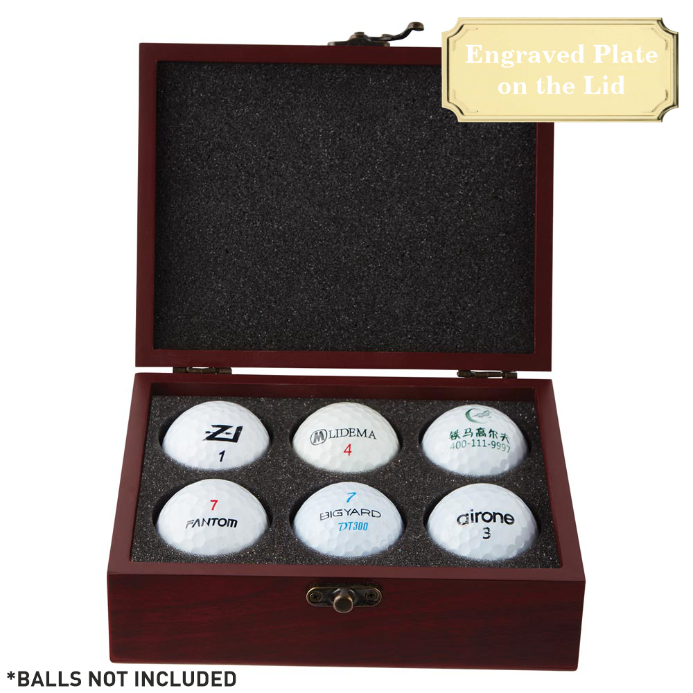 This premium presentation case award holds 6 of your own golf balls and can be engraved with your choice of words on a gold-coloured metal plaque adhered to the outside (top) of the lid. It makes a great personalised trophy gift and is suitable for a range of golf events.