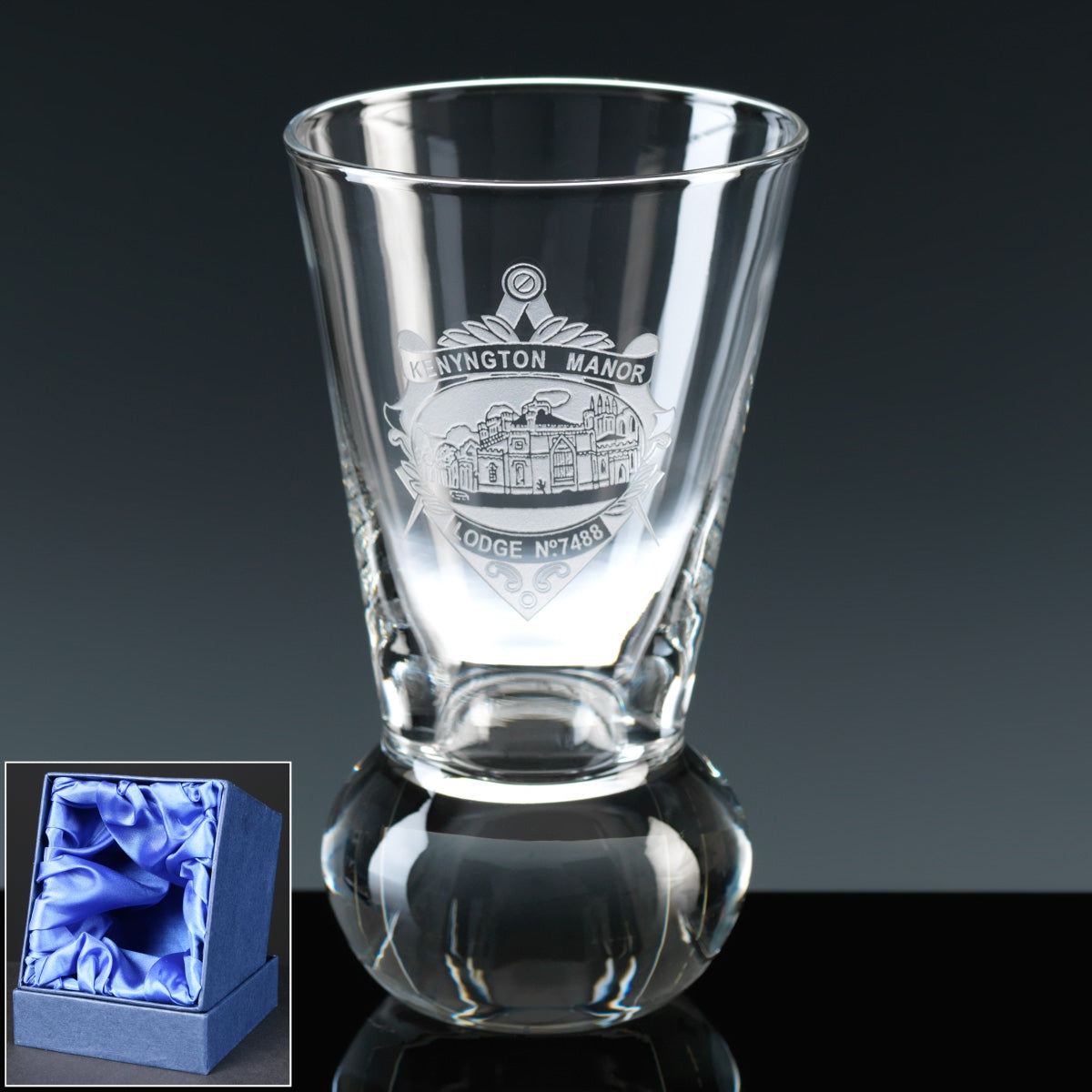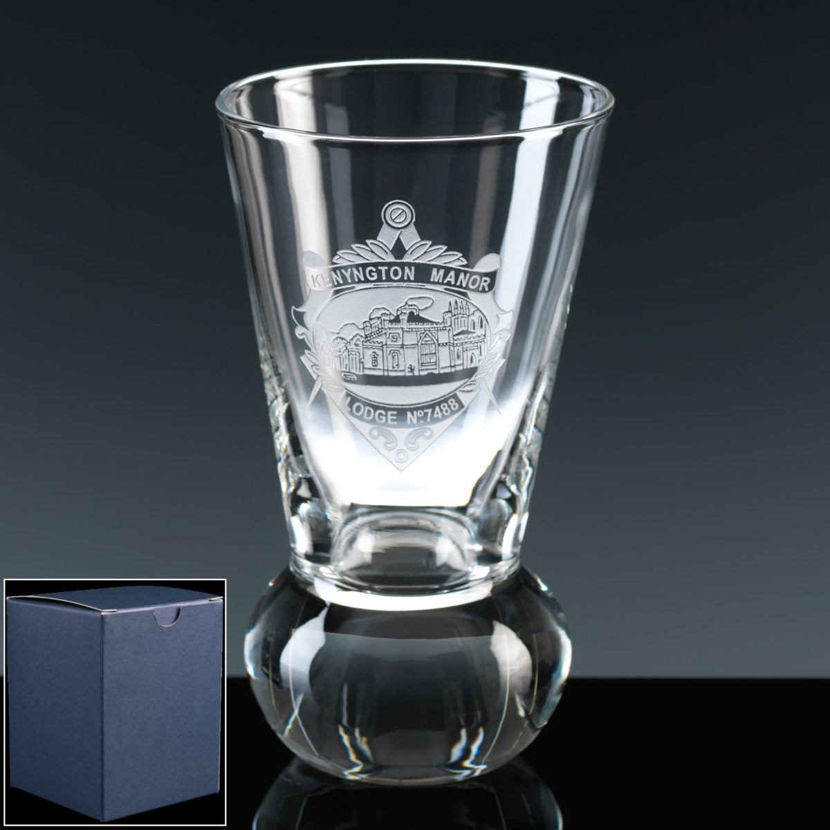 A quality hand-made Masonic Firing Glass from our Balmoral range, available with your choice of engraving carried out in-house by our skilled team. Stock masonic designs such a square and compass, or your own lodge crest/logo can be included. Sold with your choice of card gift box, or satin-lined presentation box.