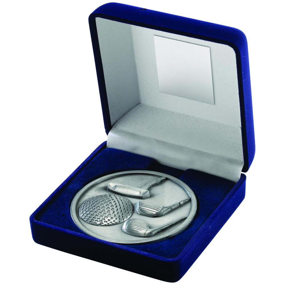 Blue Velvet Box And 70mm Medallion Golf Trophy - Antique Silver 4in. Available with optional engraving of your choice. Makes a perfect personalised trophy for all occasions or presentations.