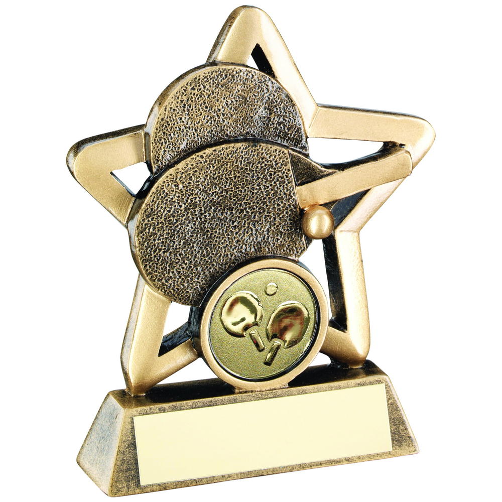 Bronze/Gold colour finish Table Tennis Mini Star Trophy (Custom 1in Centre). Available in 2 sizes with optional engraving of your choice. Makes a perfect personalised trophy for all occasions or presentations.