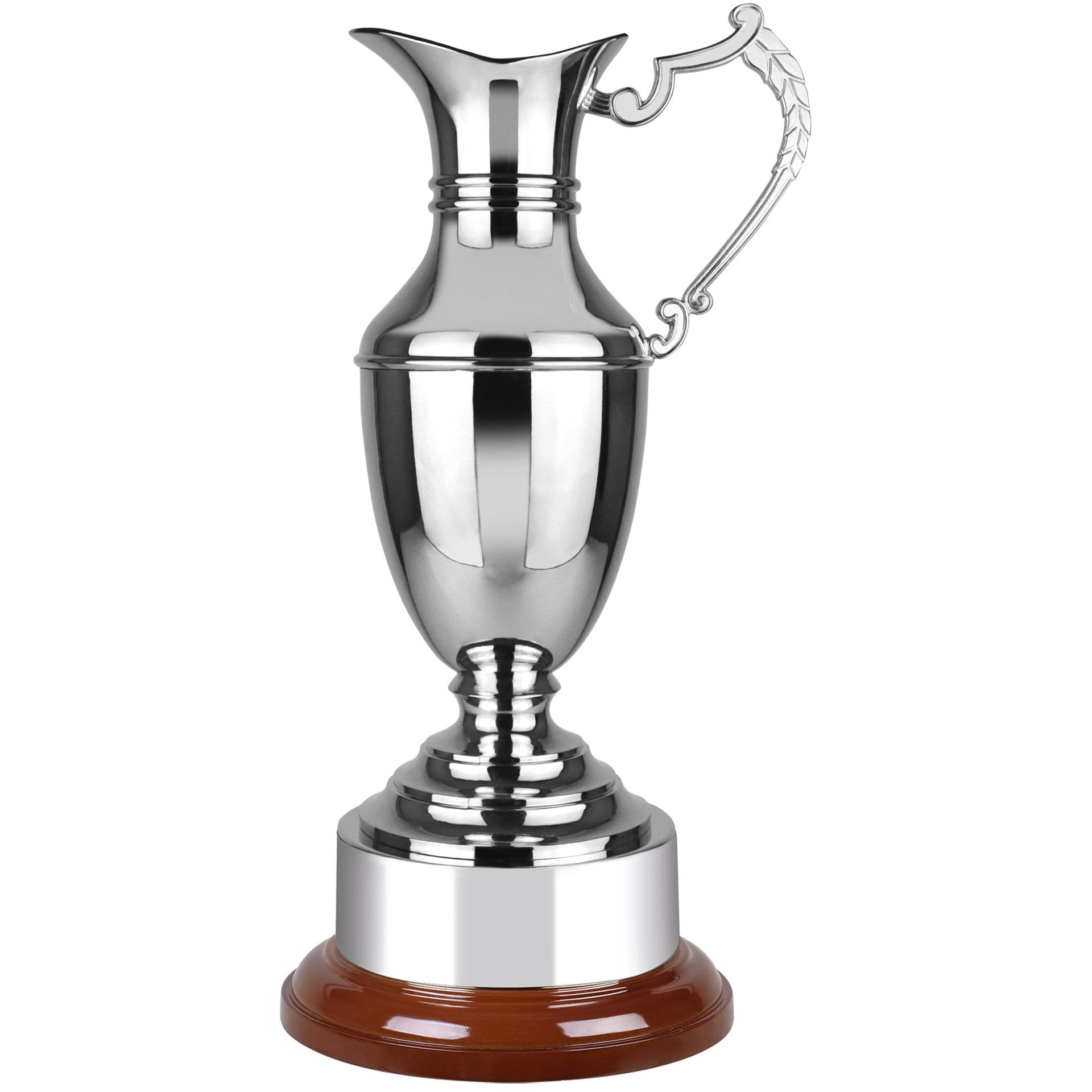 Available in 4 sizes with engraving of your choice. This silver finish nickel plated claret jug golf trophy is perfect for any event. The Award is a classic Claret Jug shape, featuring a plain high polished body and foot. There is 1 handle which has an intricate pattern inset into the metal. The jug itself is not open when looking down from above. The entire metal shape is supplied complete with a covered plinth band mounted on a rosewood finish wooden base.