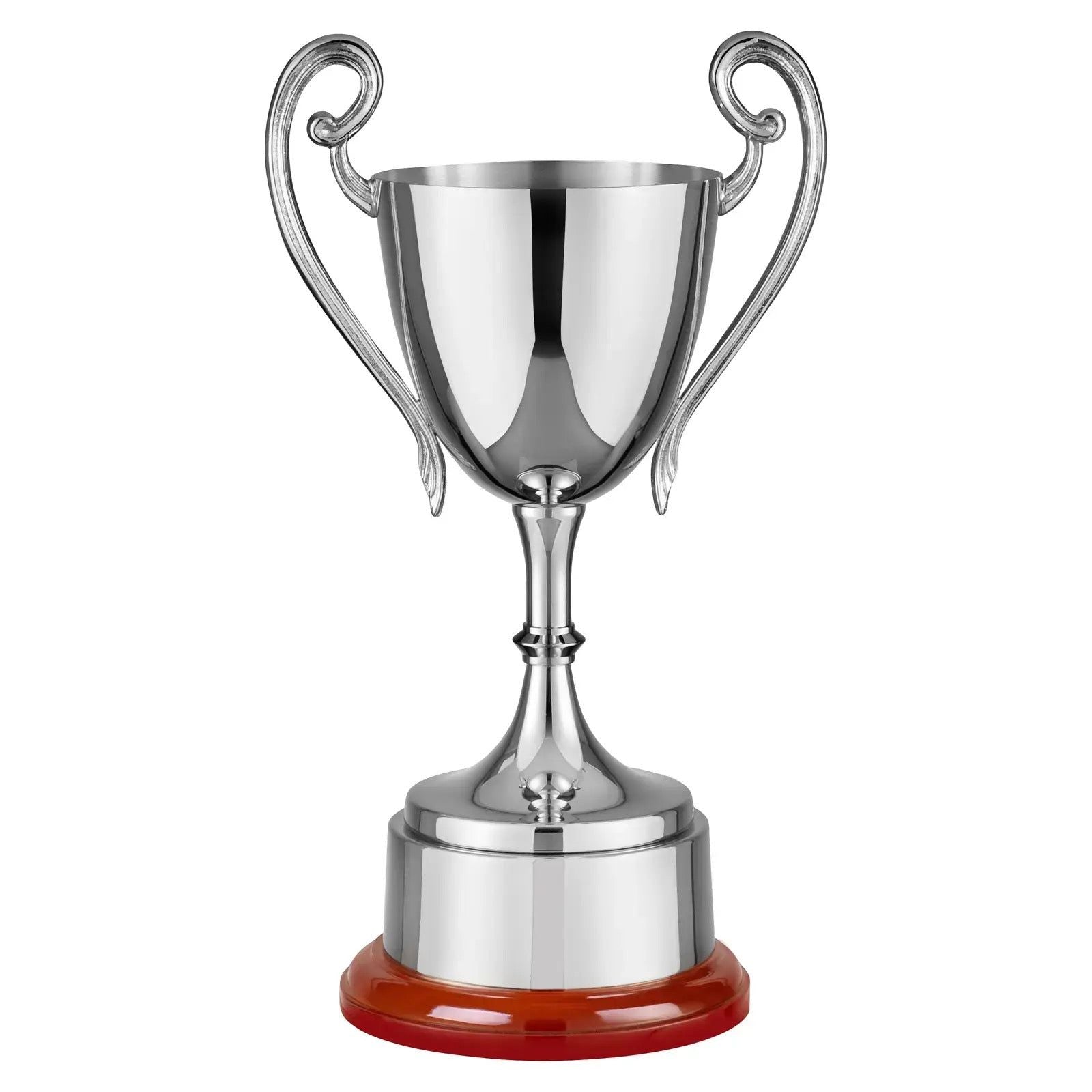 Handmade in Britain and available in 4 sizes with engraving of your choice, this nickel plated presentation trophy cup features a highly polished body, stem and foot and includes new regal style handles. It is supplied complete with a covered nickel plated plinth band mounted on a rosewood insert base.