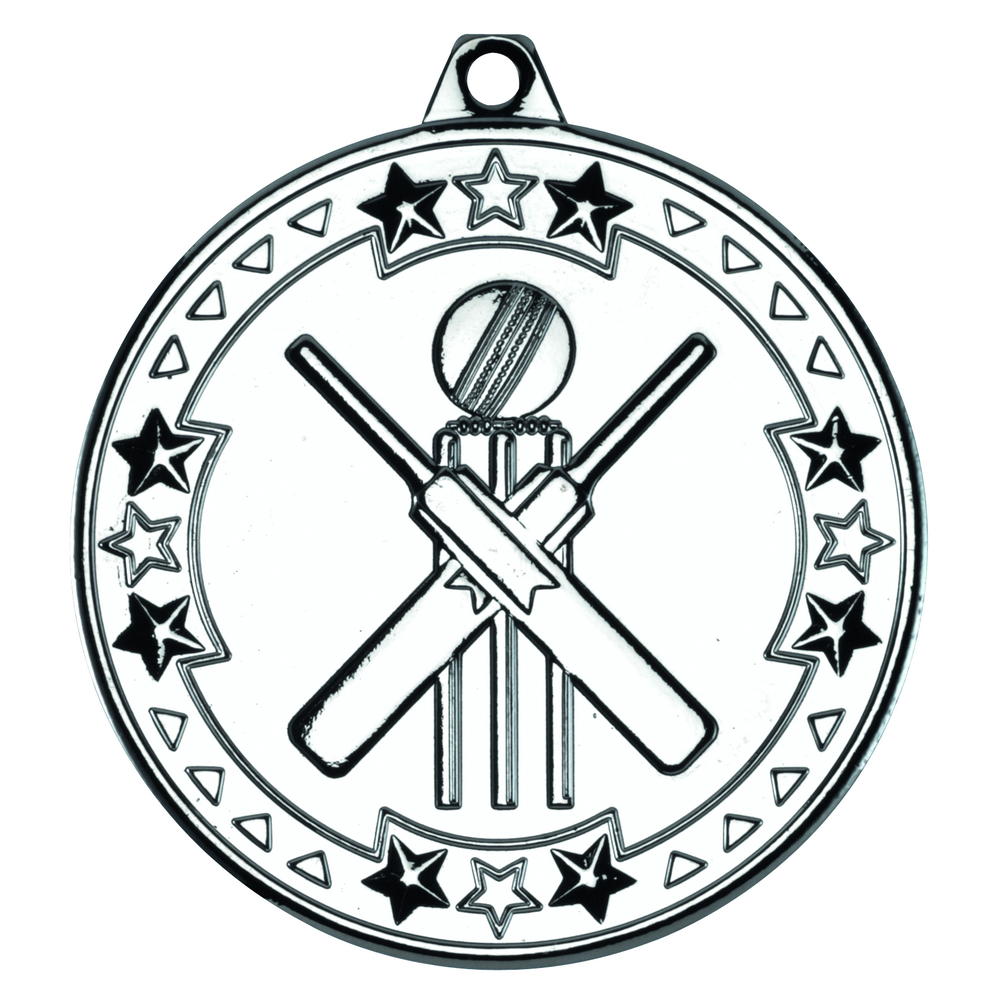 Cricket 'tri Star' Medal - Silver 2in. Made of metal, this quality medal is available with optional engraving of your choice. Makes a perfect personalised gift for all occasions or presentations.