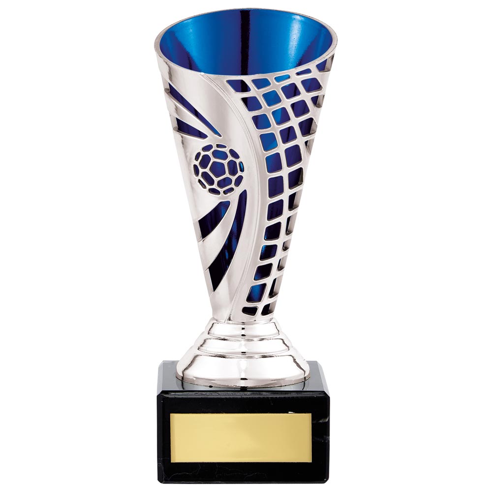Defender Football Trophy Cup Silver & Blue. Available with engraving of your choice. Perfect for football events and presentations.