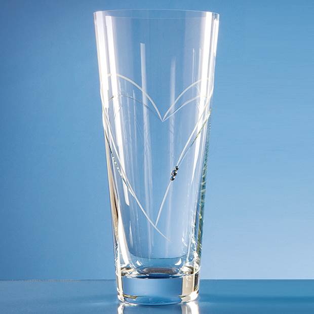 This conical vase has heart shaped detail with 3 Swarovski crystals bonded to the side of the vase. There is an engraving area that can be personalised with any logo, crest or wording making it the perfect keepsake gift for a wedding or anniversary. The vase is also available in 25cm and 30cm.