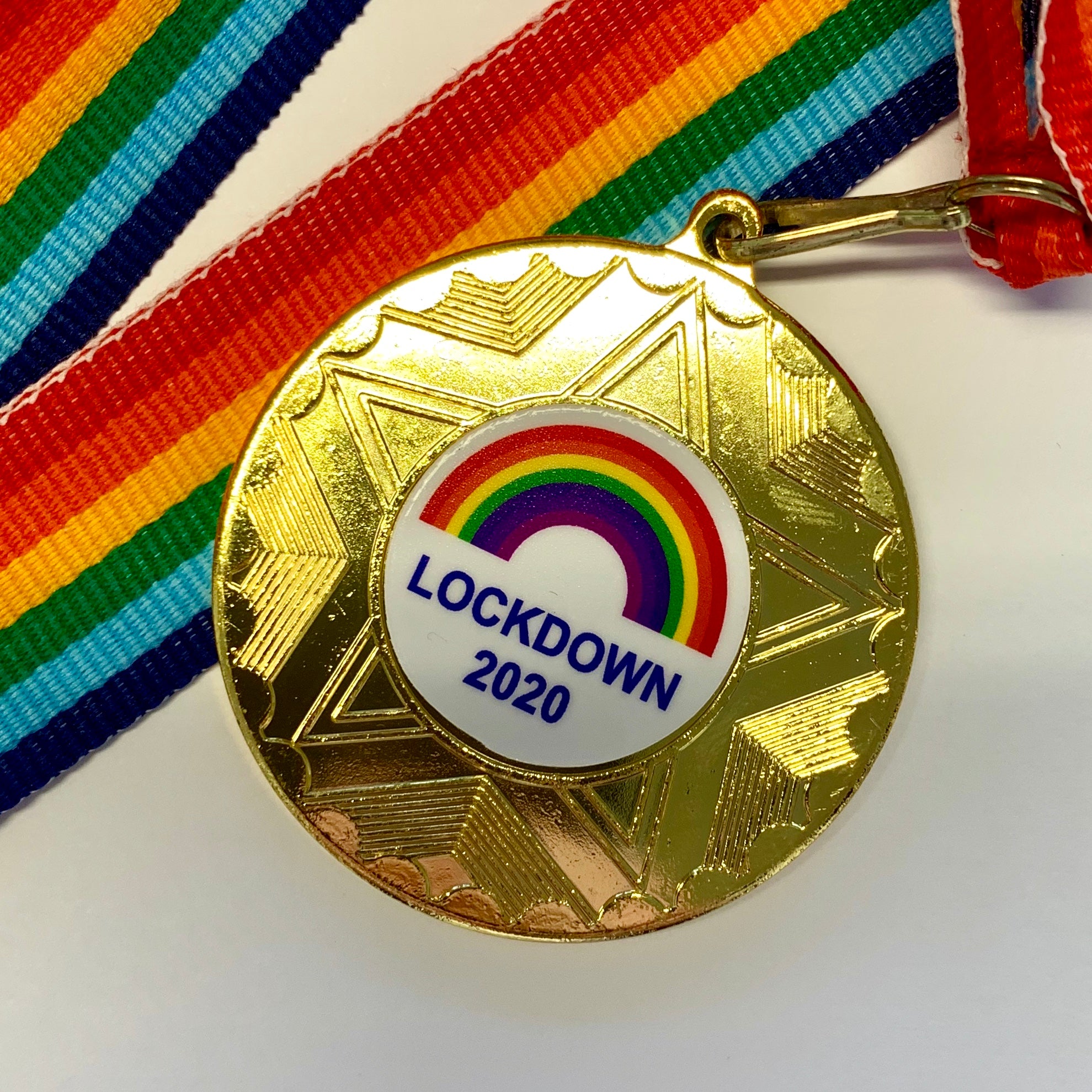 50mm Lockdown 2020 Gold Medal with Rainbow Ribbon - Available at a special discounted price of just £0.99 each (engraving can be added on the back of the medal for an additional £0.75 per medal).