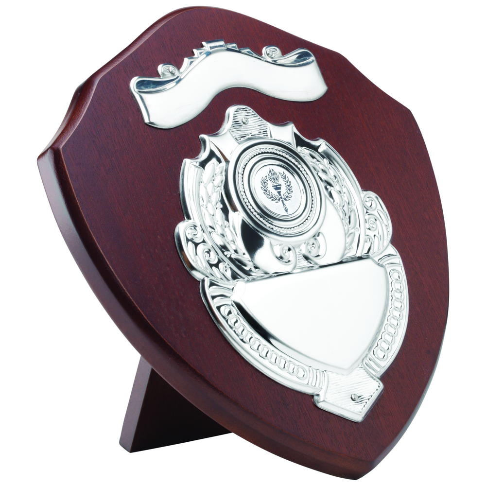 Mahogany Shield With Chrome Fronts (1in Centre) - 9in. Traditional wood veneered shield, available with engraving of your choice. Makes a perfect personalised award for all occasions or presentations.