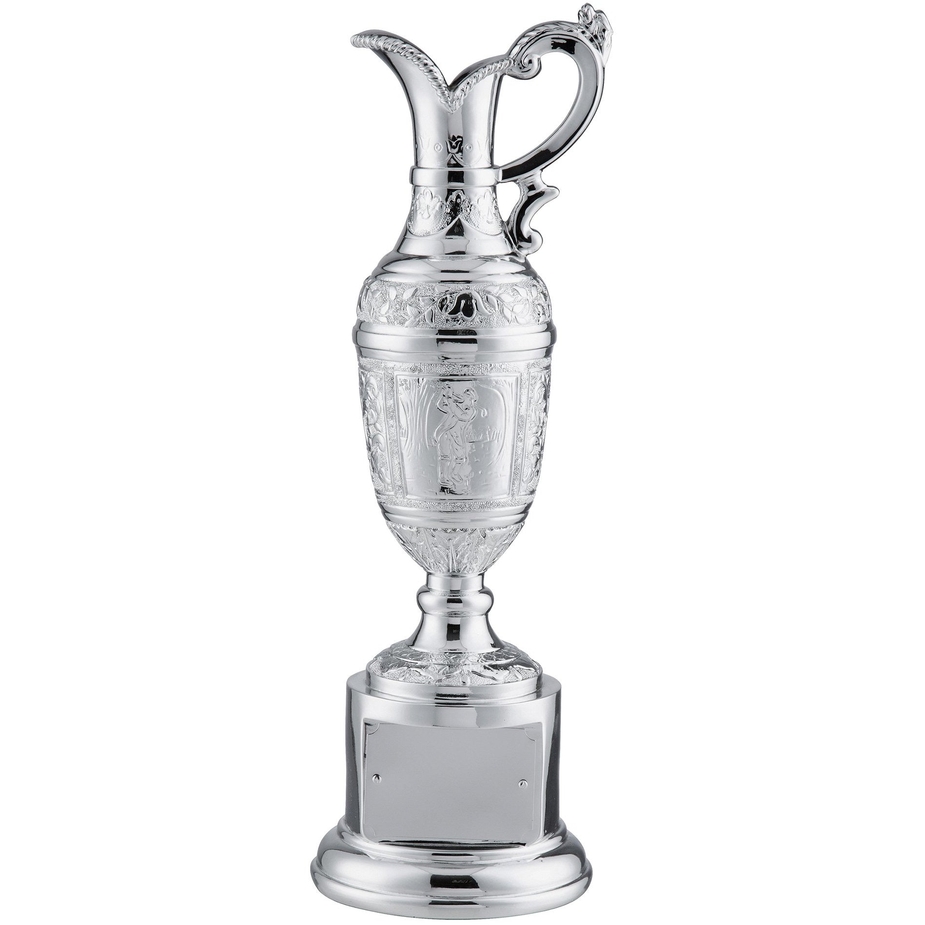This shiny electroplated silver finish claret jug features a golfing image on the sides of the jug body with a decorative handle and foot mounted on a heavyweight silver base. Available in 2 sizes, there is intricate floral patterns inset within the resin figurine which looks superb with the shiny reflective coating. They are supplied complete with a silver engraving plate which makes it ideal for engraving.