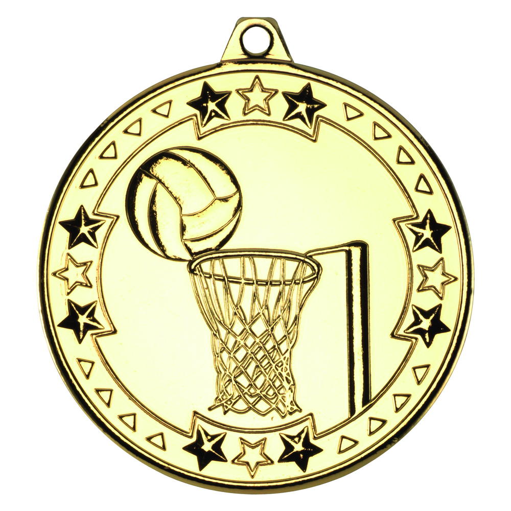 Netball 'tri Star' Medal - Gold 2in. Made of metal, this quality medal is available with optional engraving of your choice. Makes a perfect personalised gift for all occasions or presentations.