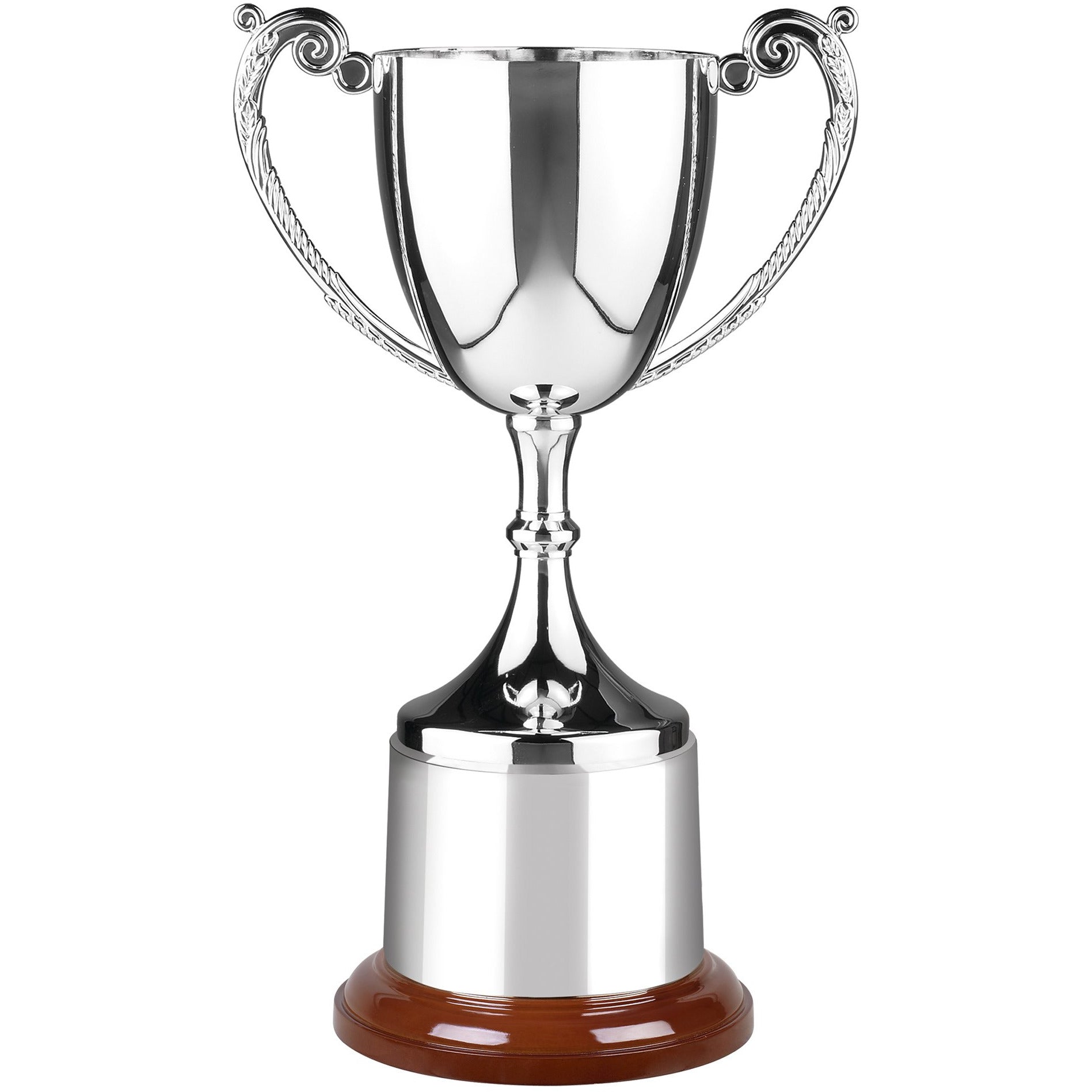 This Silver Nickel plated presentation trophy cup features a highly polished body, stem and foot and features traditional style handles. It comes complete with an extra tall covered plinth band (perfect for engraving many names as a perpetual award) mounted on a rosewood finish wooden base. Available in 5 sizes.