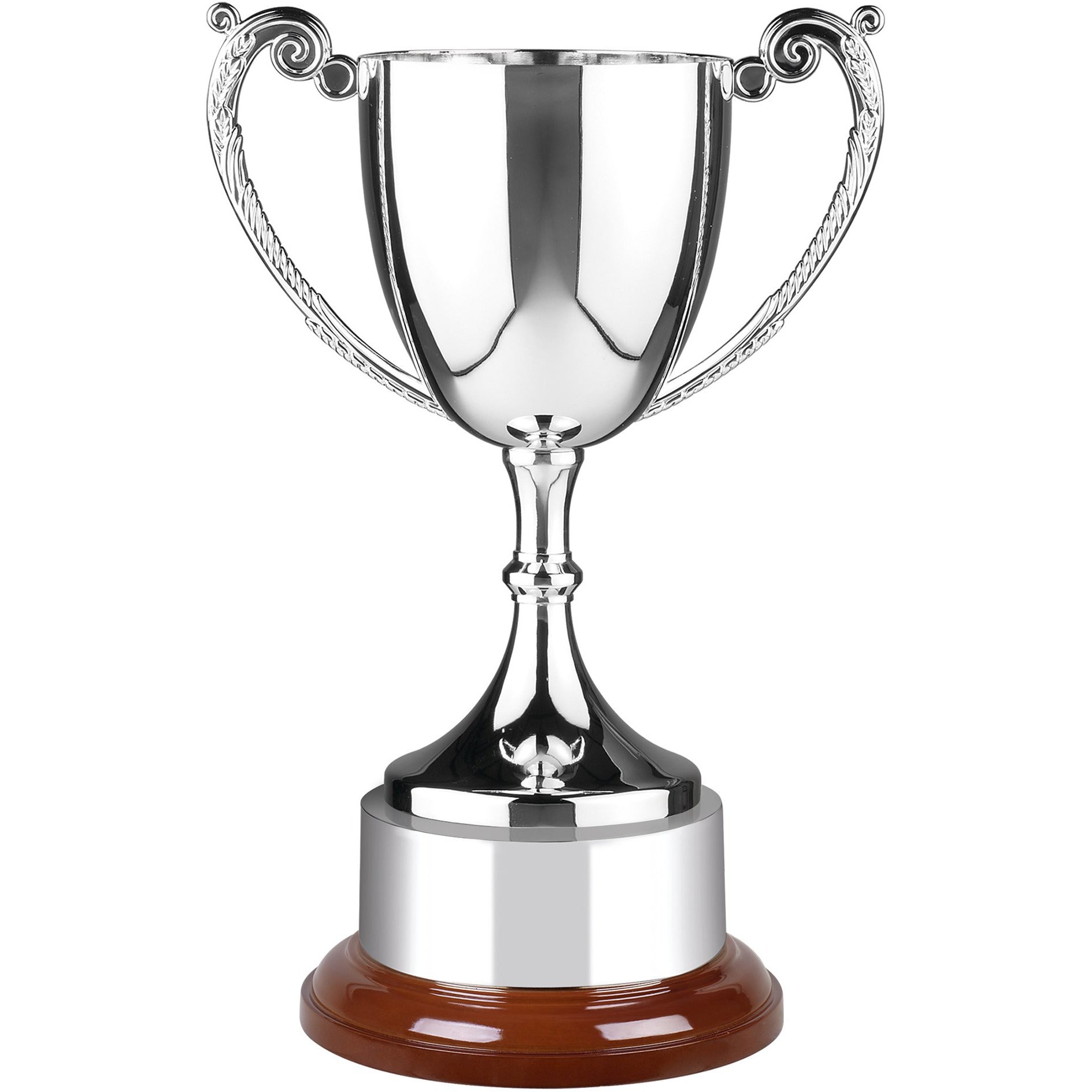 Available in 6 sizes with engraving of your choice. This Silver Nickel plated presentation trophy cup features a highly polished body, stem and foot and features traditional style handles. It comes complete with a covered plinth band mounted on a rosewood finish wooden base.