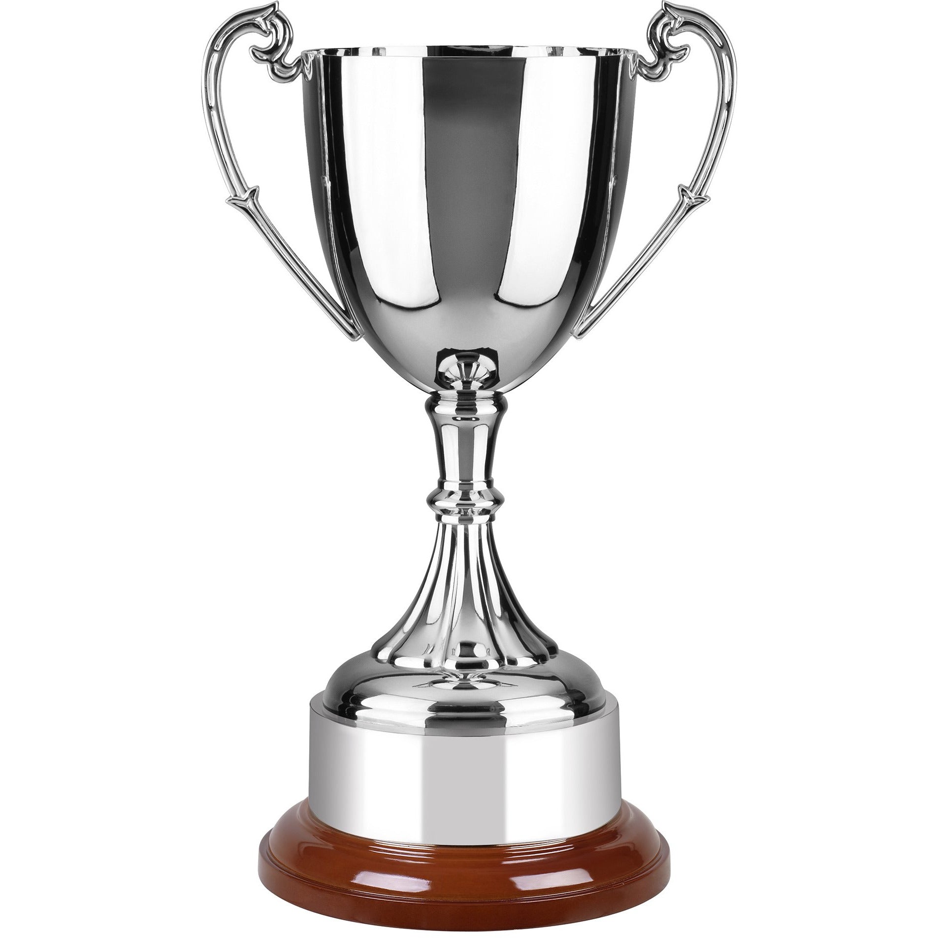 Available in 7 sizes with engraving of your choice. This Silver Nickel plated presentation trophy cup features a highly polished body, a fluted stem and foot and features fluted style handles. It comes complete with a covered plinth band mounted on a rosewood finish wooden base.