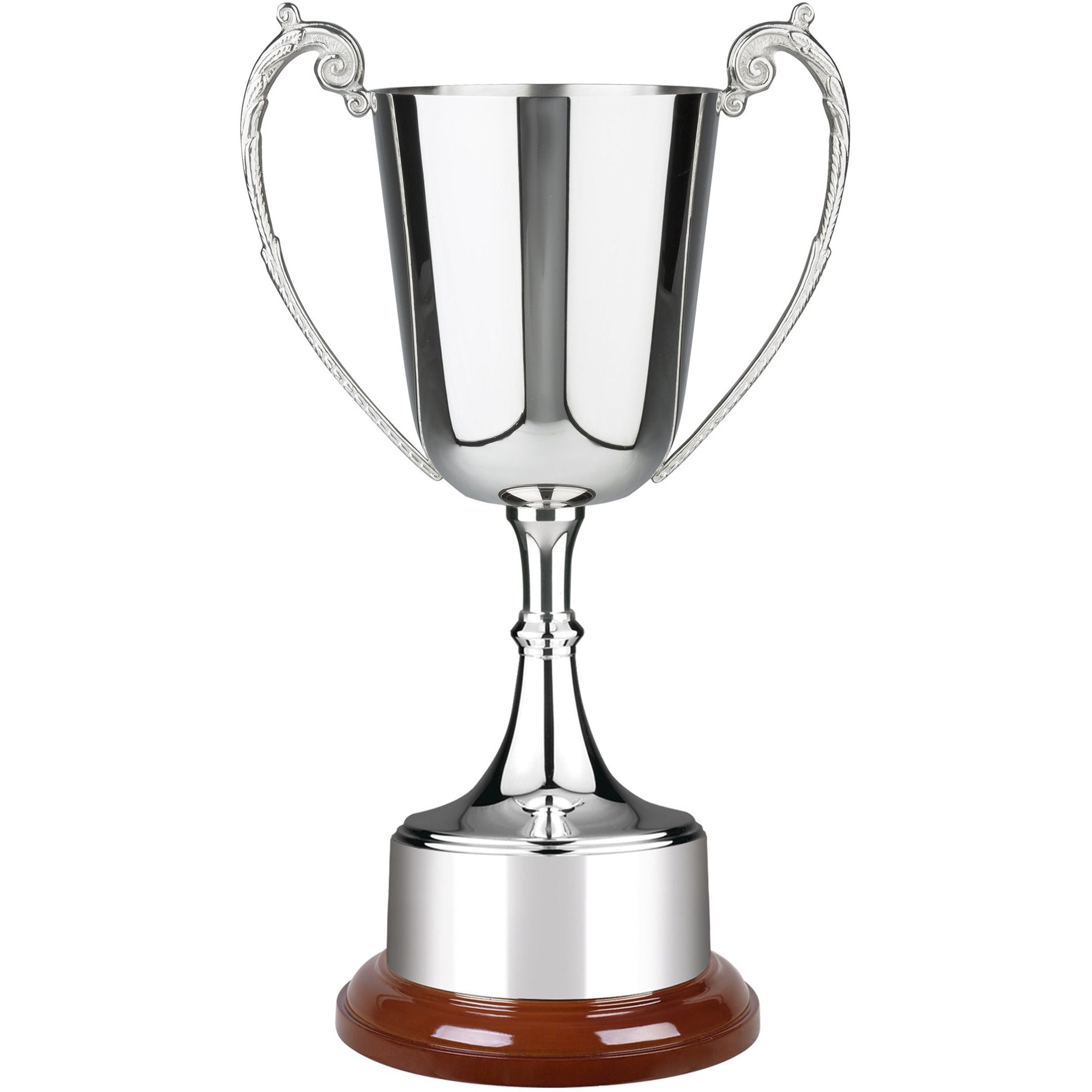 Available in 3 sizes with engraving of your choice. Handmade in Great Britain, this Advocate silver plated Formula presentation trophy cup features a highly polished body, stem and foot and includes 2 traditional patterned handles either side of the body. This particular shape trophy body and stem is traditional and similar styles have been used for centuries for presentation requirements. The Trophy itself is supplied complete with an integral plinth band, which connects from the central section, so it cannot be removed. The integral band is fitted complete to a rosewood insert base which has a felted bottom.