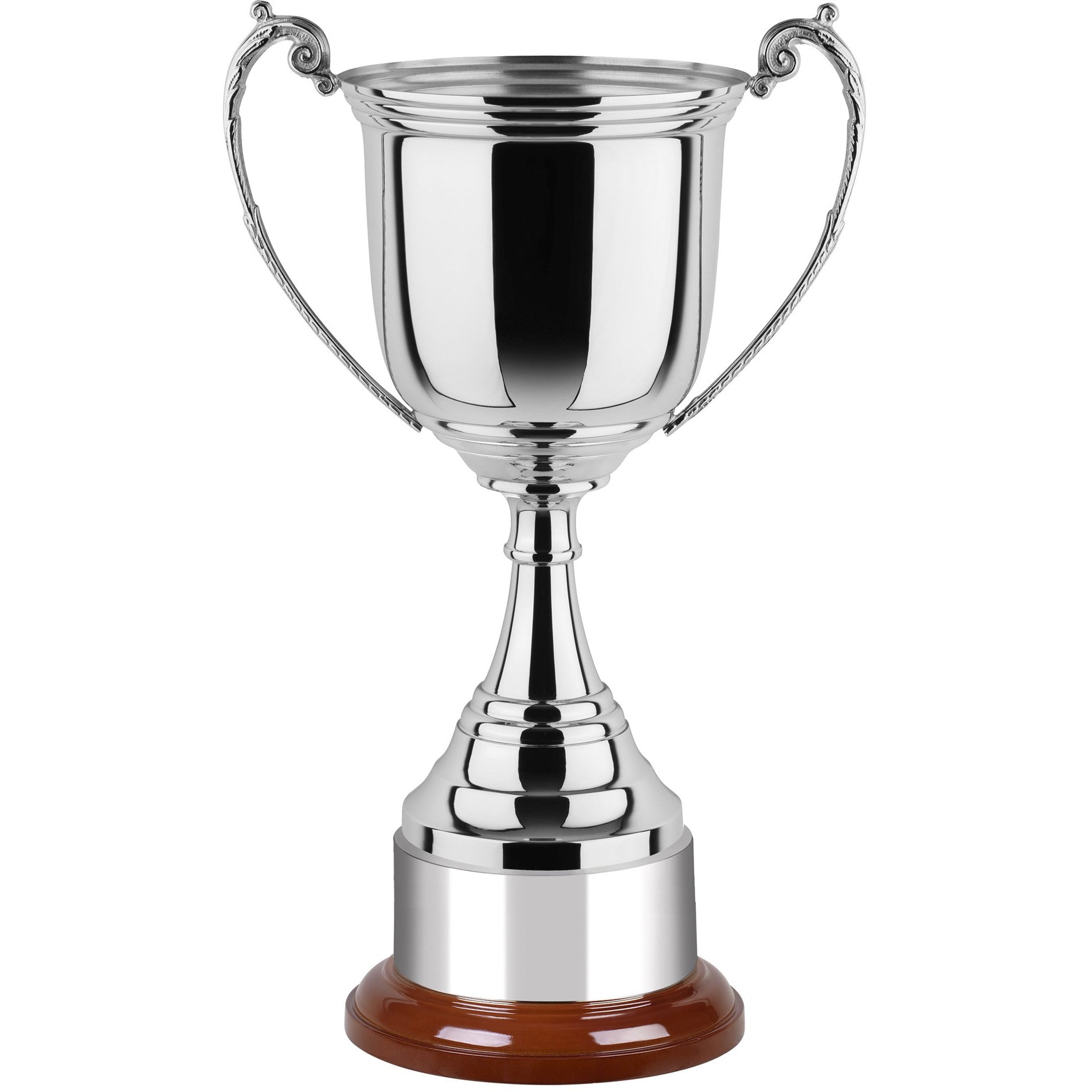 Handmade in Britain and available in 4 sizes with engraving of your choice. This revolution nickel plated trophy features a highly polished body, complete with a nickel plated plinth band mounted on a rosewood finish base. Only the finest materials have been selected to manufacture these revolutionary awards. Keeping traditional values and Great British quality.