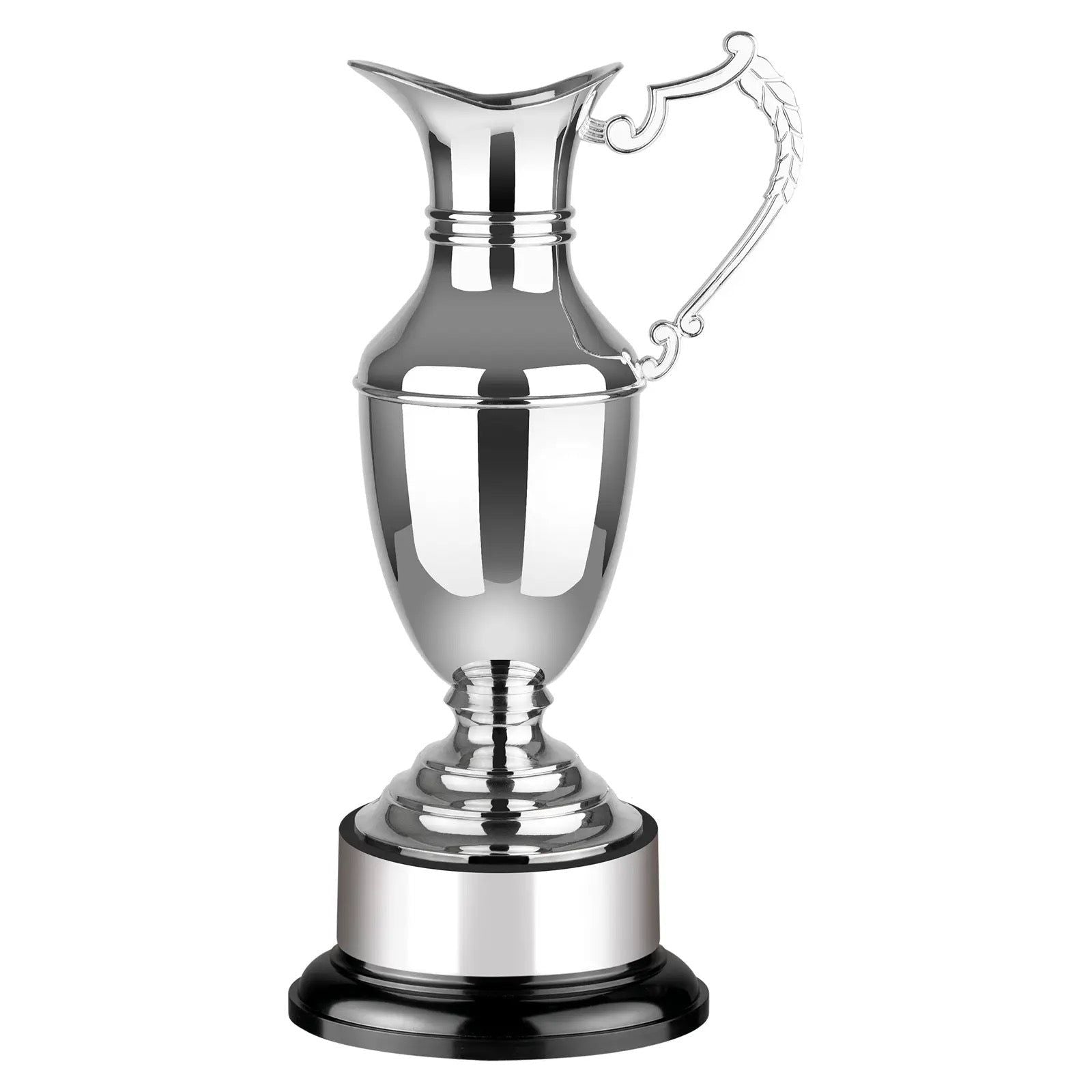 This silver finish nickel plated claret jug golf trophy is available in 4 sizes and perfect for any event. Add engraving of your choice to the jug body and/or base. The Award is a classic Claret shape, featuring a plain high polished body and foot. There is 1 handle which has an intricate pattern inset into the metal. The jug itself is not open when looking down from above. The entire metal shape is supplied complete with a nickel plated plinth band and a black Bakelite base.