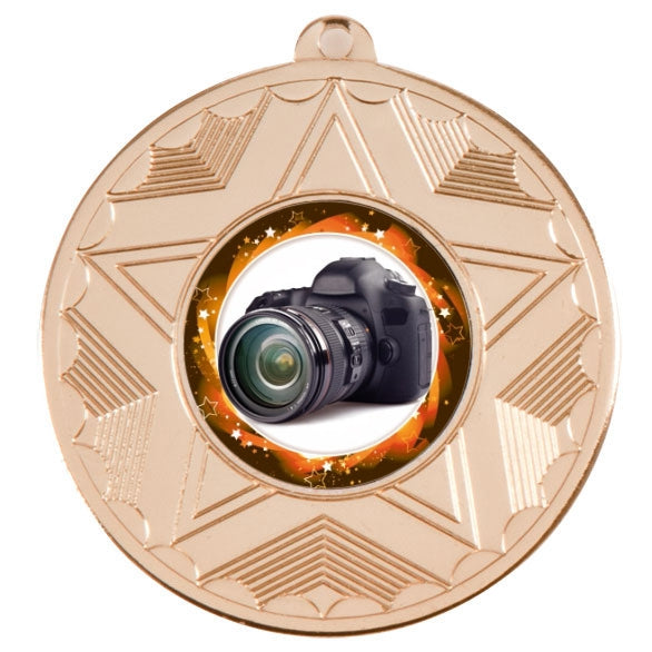 Photography 50mm (2") Metal Medal - Complete with 25mm (1") centre disc. Suitable for personalised engraving of your choice on the back. Available with optional ribbon and/or box. Your own image / club logo can be uploaded, which will replace the centre disc shown.