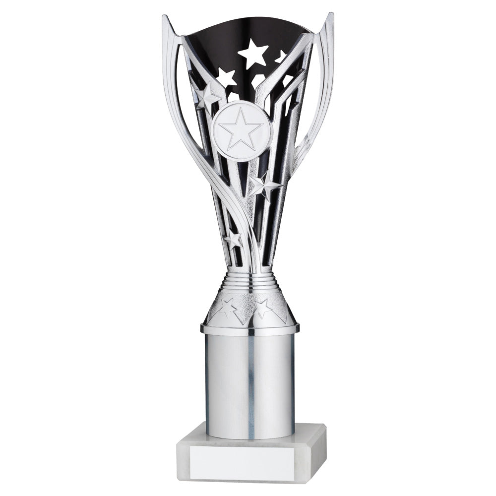 Silver/Black Plastic 'Flash Star' Trophy Cup With Riser On White Marble Base