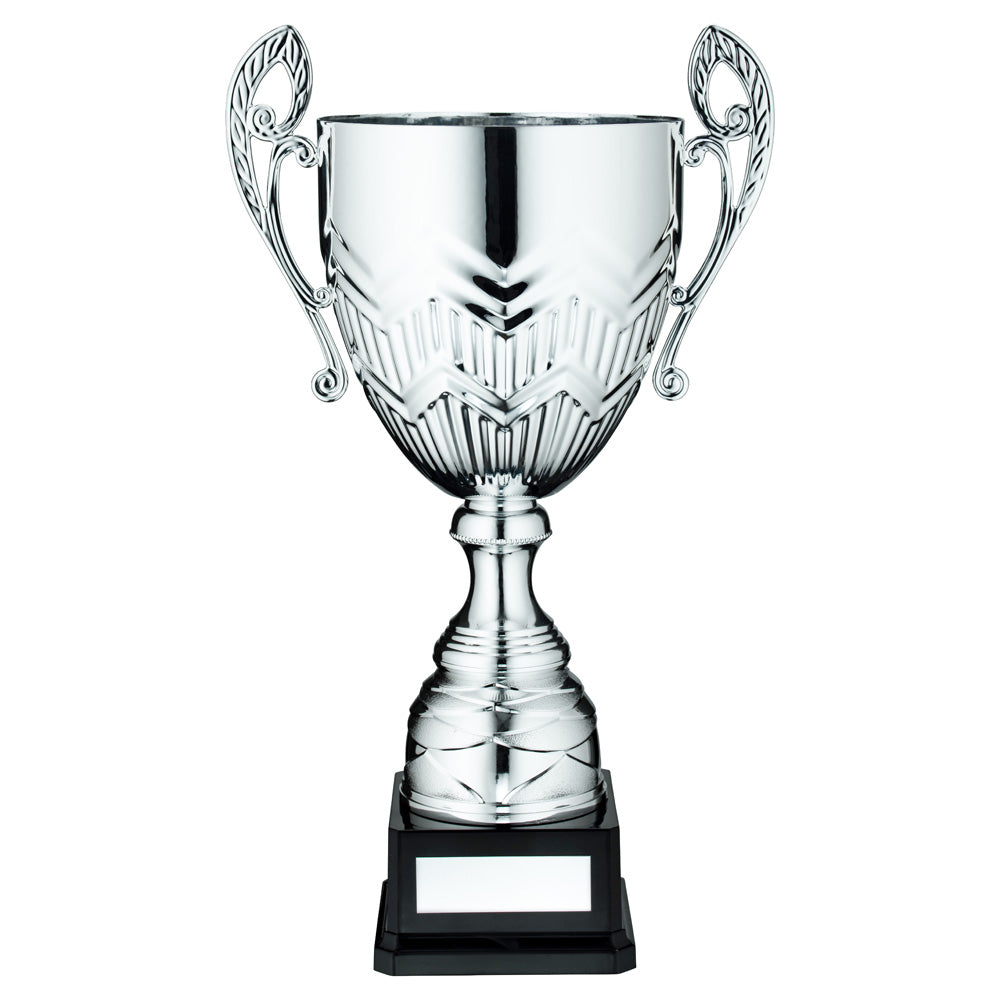 Featuring a classic waved pattern on the cup body with handles, this metal trophy cup is complimented with a black plastic base. Add engraved words of your choice to the personalised silver coloured metal plaque as shown on the base to make it extra special. Available in 7 sizes.