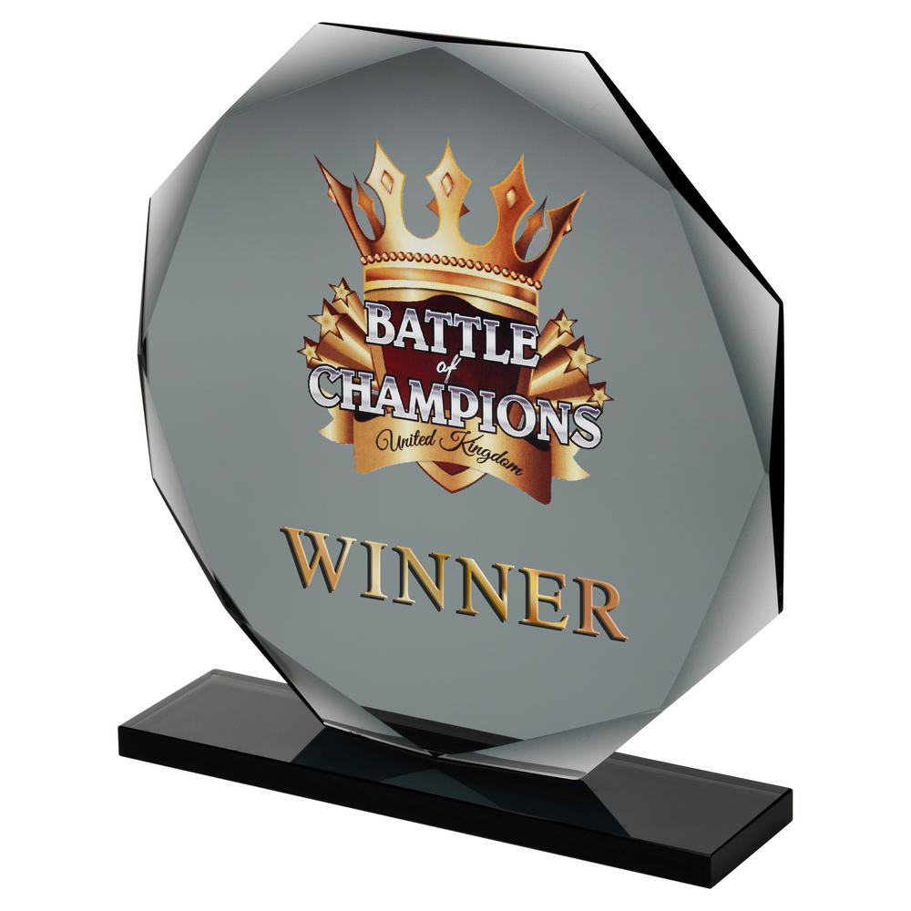 Personalised Smoked Black Glass Award - Octagon Plaque (10mm Thick Glass). Available in 3 sizes with colour printing of text and a logo/design of your choice. Makes a great value gift or award for events, presentations and more!