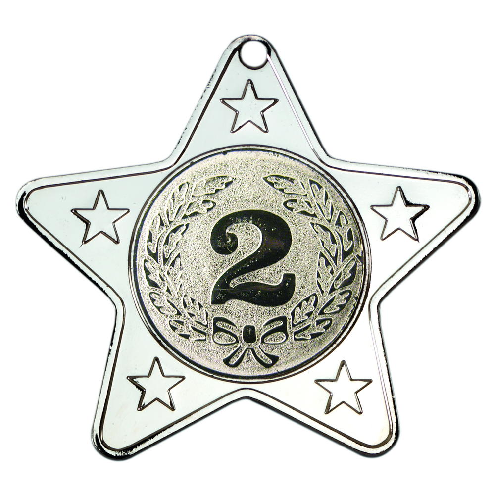 Star Shaped Medal With 5 Mini Stars (1in Centre) - Silver 2in. Made of metal, this quality medal is available with optional engraving of your choice. Makes a perfect personalised gift for all occasions or presentations.