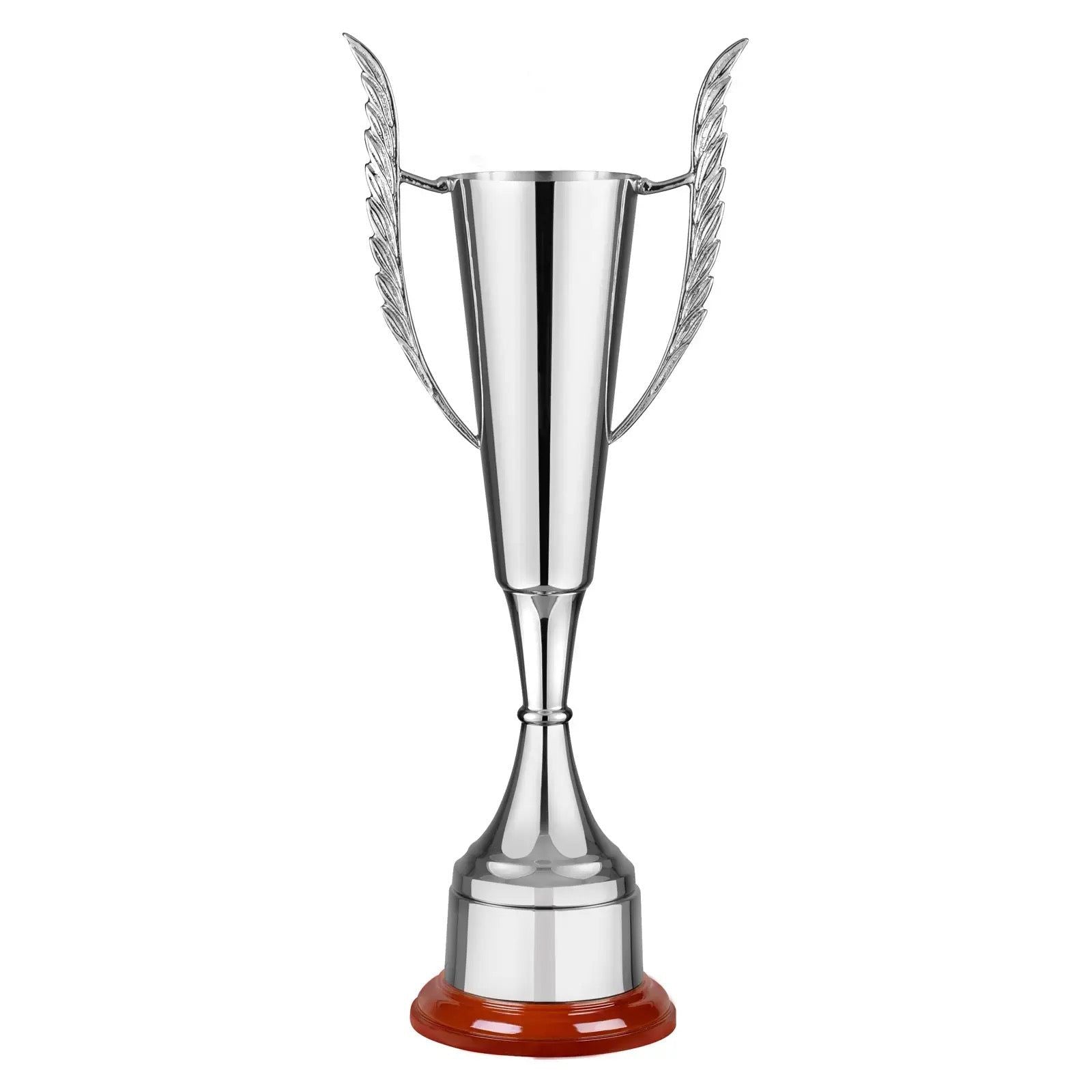 Handmade in Britain and available in 3 sizes with engraving of your choice. This nickel plated presentation trophy cup features a highly polished body, stem and foot and includes new feather style handles. It is supplied complete with a covered nickel plated plinth band mounted on a rosewood insert base.